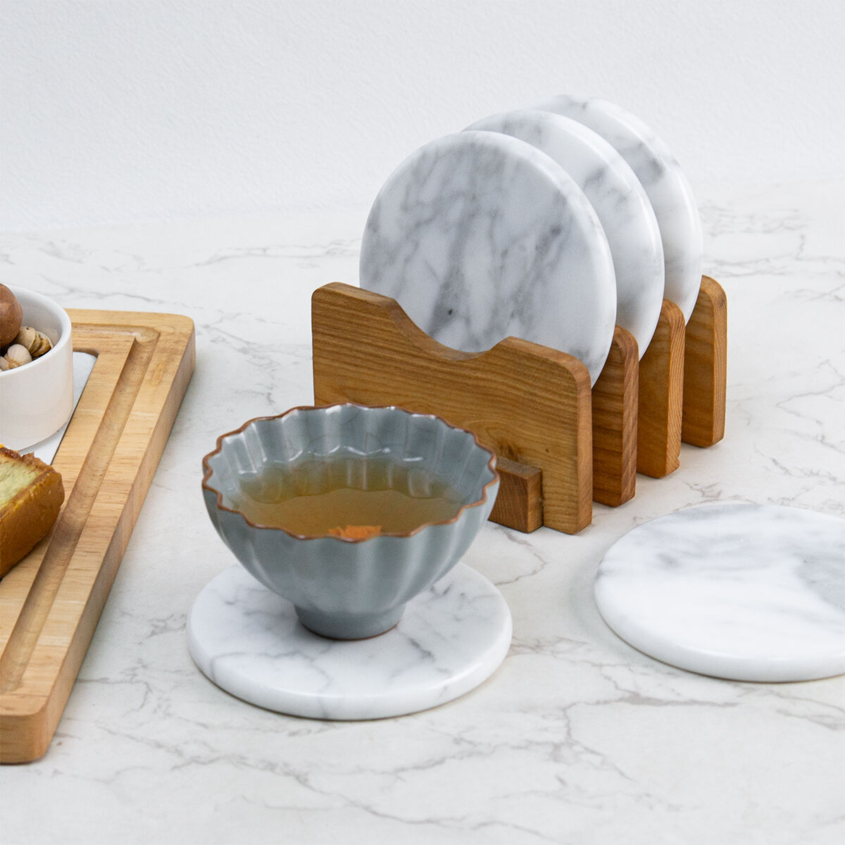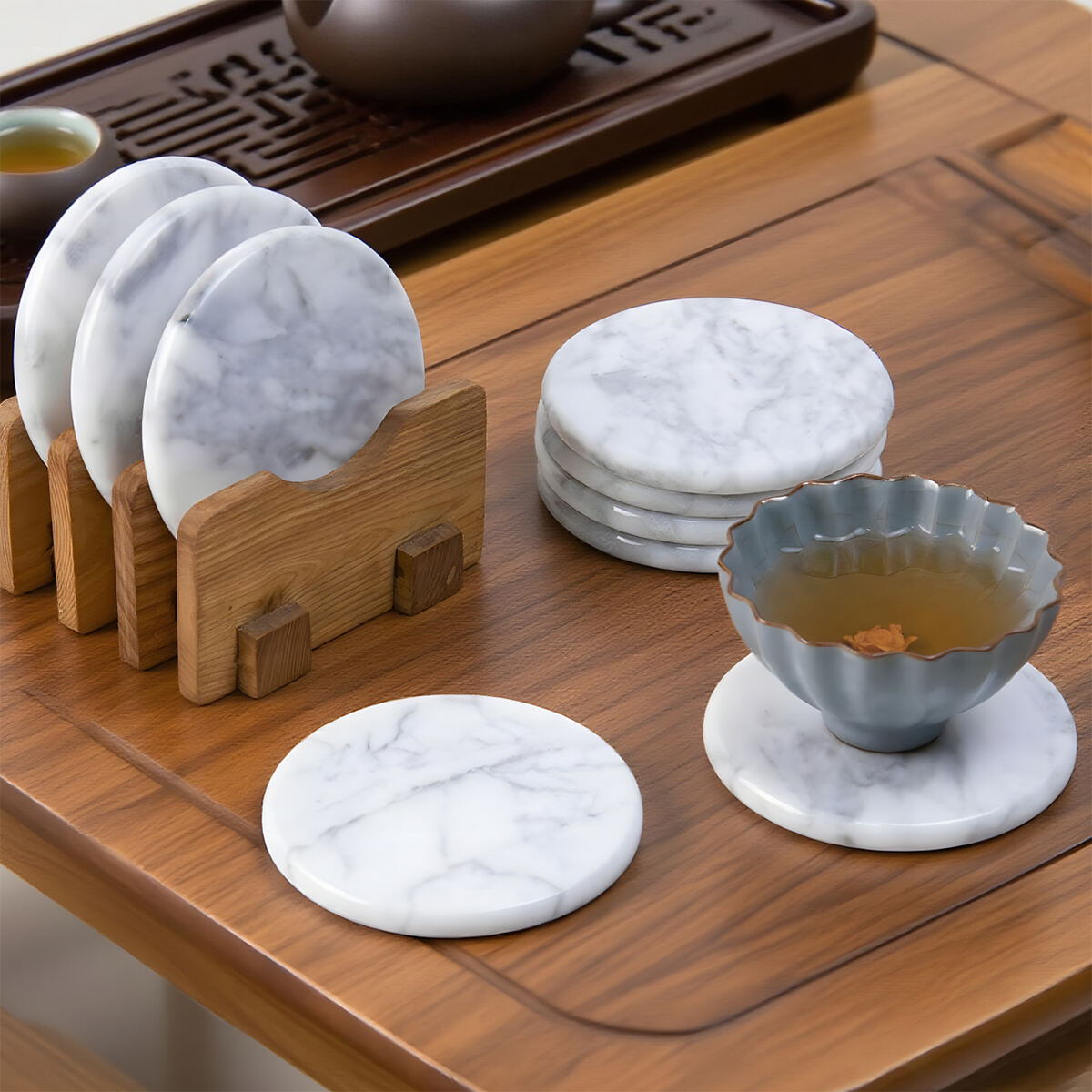 Stock up on these premium marble drink coasters, a top-tier choice for protecting surfaces in style. Each set features three robust, 9.3cm coasters crafted from high-density marble, renowned for its excellent heat and moisture resistance. The included Acacia wood stand offers a convenient storage solution, enhancing the set's retail appeal. We focus on bulk manufacturing and full OEM customization, from laser engraving your logo directly onto the coaster surface to creating unique gift boxes, empowering your brand in the competitive home goods market.