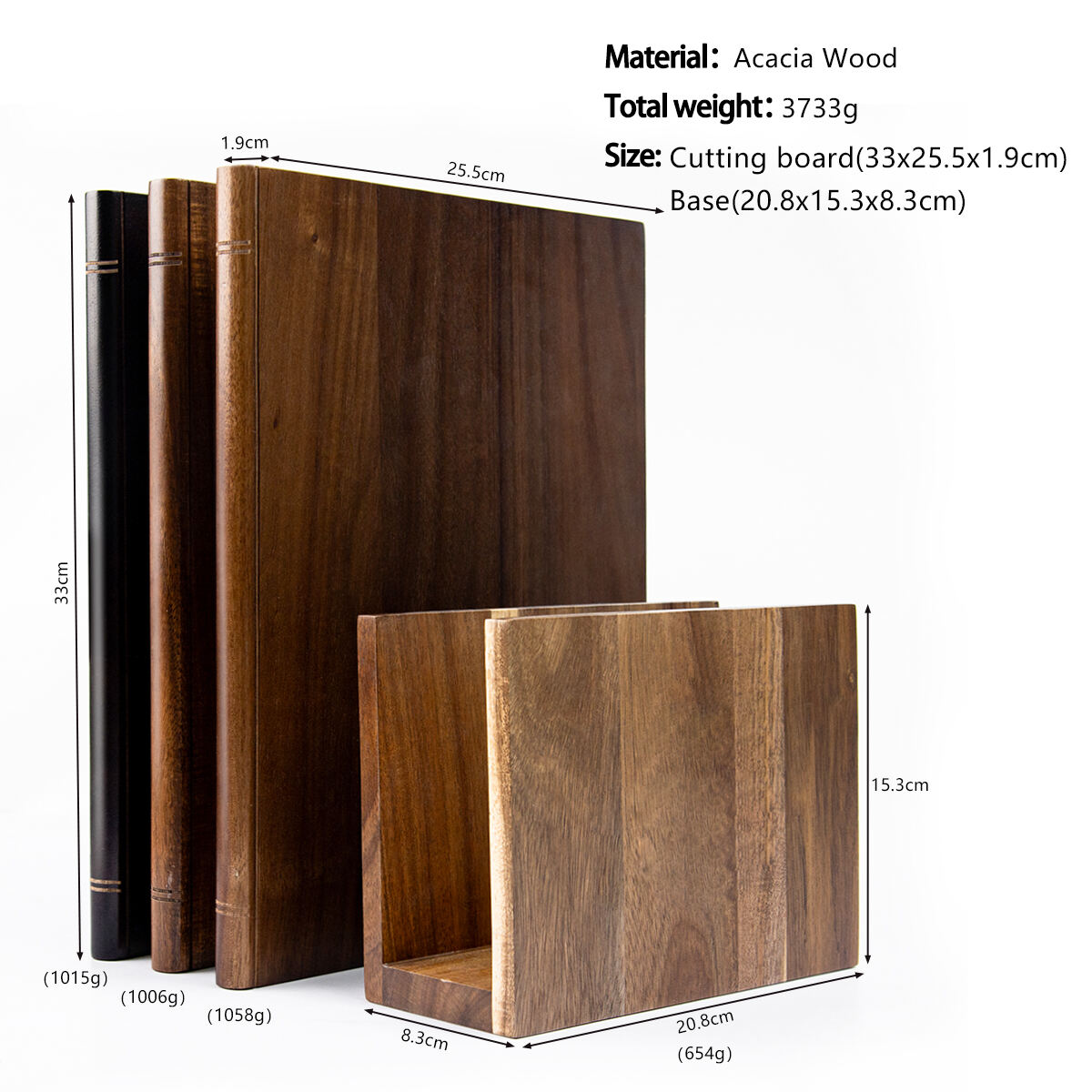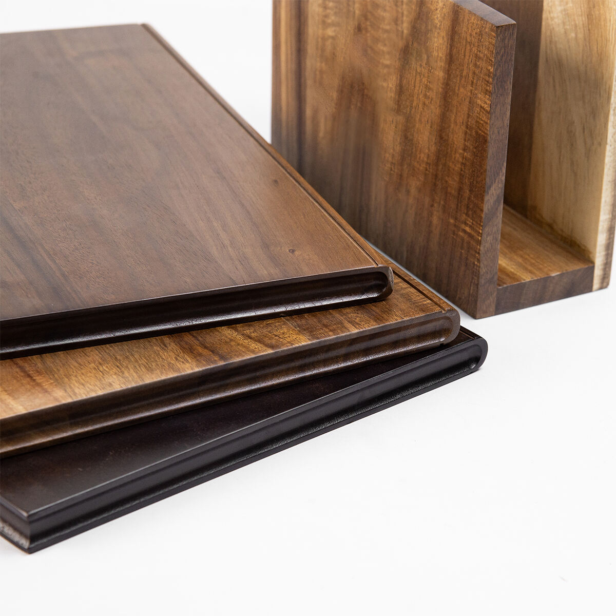 Vous recevez trois planches rectangulaires de taille standard (33x25,5x1,9 cm) et un support en bois solide. Grâce à un procédé de coloration spécialisé, chaque planche met en valeur une teinte distincte du veinage naturel de l'acacia, créant un bel effet dégradé lorsqu'elles sont exposées ensemble. Les détails gravés au laser sur le dos ajoutent une touche d'élégance, les rendant pratiquement indiscernables d'un ensemble de beaux livres. Ce récit de conception cohérent est un atout pour votre équipe marketing, offrant une histoire prête à l'emploi sur le style et le raffinement, que ce soit pour la décoration de cuisine, salle à manger ou même pour des fêtes.